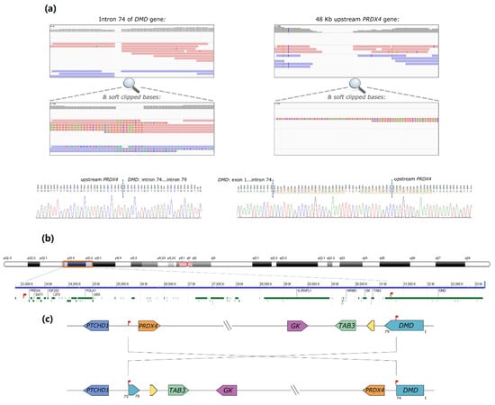 (a) Low coverage WGS results suggesting a genomic inversion. Visual BAM file inspection showed a possible breakpoint within intron 74 of DMD (1A). Some reads contained soft-clipped bases with homology with a region 48 kb upstream of the PRDX4 gene (Xp22.1). Correspondingly, some partially aligned reads in the PRDX4 region showed homology with inverted intron 74 DMD sequences; (b) Inversion breakpoints were confirmed by Sanger sequencing. In breakpoint 2 (right) the inversion originated a 21 bp duplication (boxed in orange) and the inclusion of a short sequence with no homology to the reference genome. There was also a loss of 9 bp in DMD intron 74 and of 3 bp in the upstream PRDX4 region; (c) Schematic representation of the inversion at the genomic level. The inversion involves Xp22.1 to Xp21.2 (~8 Mb), comprising 74 genes. Breakpoints are localized 48 kb upstream of the PRDX4 gene (breakpoint 1) and within intron 74 of the DMD gene (breakpoint 2).