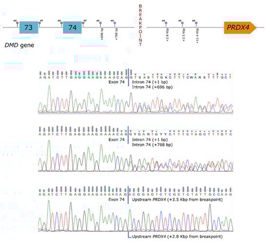 To further characterize the aberrant DMD transcripts, several specific primers were designed to target the DMD exon/intron 74 and the PRDX4 upstream regions (primer sequences available on request). PCR assays were set up using different primer combinations. Amplicons were resolved on an agarose gel and sequenced as described above.