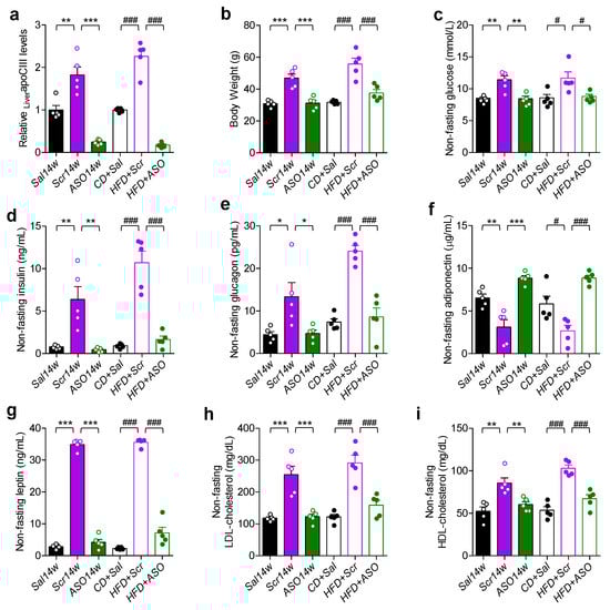 2.1. ApoCIII Reduction Improves Metabolic Status in HFD-Fed Mice