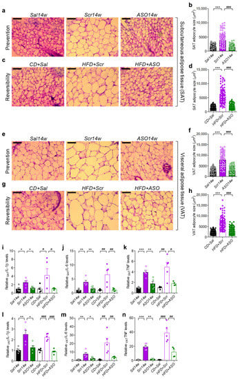The HFD-induced hypertrophy of adipocytes in SAT and VAT in Scr-treated mice was prevented and reversed by decreasing apoCIII with ASO (Figure 2a–h). Elevated levels of apoCIII are related to inflammation [,], and there was an upregulation of the expression of genes for the inflammatory cytokines interleukin-1beta (IL-1β), interleukin-6 (IL-6) and tumor necrosis factor-α (TNF-α) in the obese, compared to ASO-treated and control, mice (Figure 2i–n).