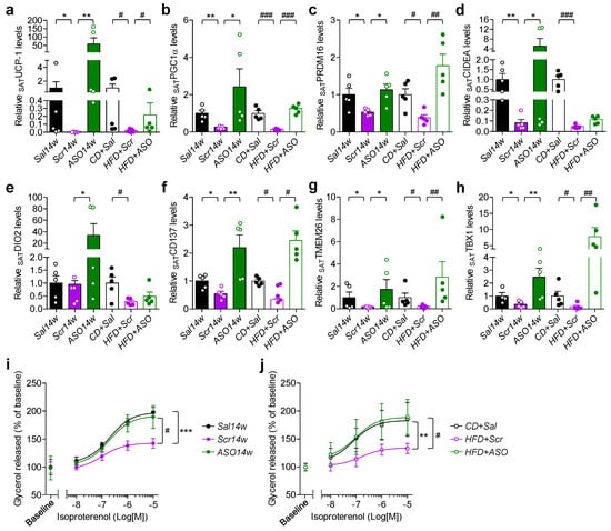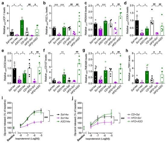 The gene markers for thermogenesis and beiging, analyzed in SAT (Figure 3a–h), were also determined in VAT. All ASO-treated mice, compared to Scr-treated mice, had an upregulation of these genes (Figure 4a–h). As in SAT, there was a normalization of the expression of the genes for ATGL and HSL lipases and isoproterenol-induced lipolysis by decreasing apoCIII (Figure 4i,j and Figure S1E–H).