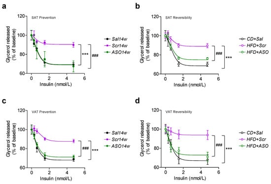 ApoCIII reduction improves WAT insulin sensitivity. (a–d) Concentration-dependent inhibition of isoproterenol-induced lipolysis by insulin in isolated adipocytes from (a,b) SAT from mice in (a) the prevention and (b) the reversibility studies and (c,d) VAT from mice in (c) the prevention and (d) the reversibility studies. Data are expressed as mean ± SEM of n = 5 individual mice per experimental group and controls. *** p < 0.001 for differences in the prevention study. ### p < 0.001 for differences in the reversibility study.