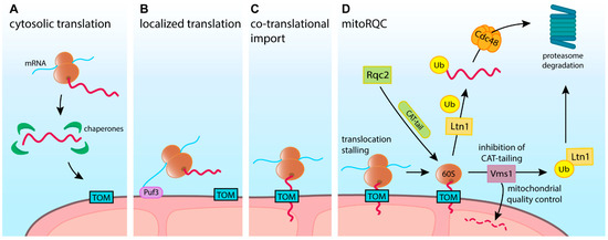 Location of mitochondrial precursor proteins’ synthesis affects their import mode. (A) Cytosolic translation and post-translational import expose precursors to the cytosolic environment. Precursors require guidance by chaperones, which prevent their misfolding or premature degradation. (B) Localized translation with ribosome or mRNA binding to the outer membrane by proteins such as Puf3, decreases the import distance. (C) Co-translational import protects precursors from the cytosolic environment. (D) MitoRQC responds to translation stalling during co-translational import. Rqc2 (ribosome quality control complex subunit in yeast) is adding a CAT-tail to the nascent precursor to facilitate its ubiquitination by Ltn1 ligase. Subsequently, ubiquitinated protein is guided by Cdc48 to proteasomal degradation. Alternatively, Vms1 has the ability to inhibit CAT-tailing and allows stalled precursors to alternate between proteasomal degradation or mitochondrial quality control.