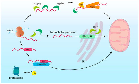 Unexpectedly, ER-located Hsp40s are also involved in routing the precursors to mitochondria along a path called ER surface-mediated protein targeting (ER-SURF). In ER-SURF, hydrophobic precursors are captured by ER-localized Hsp40s, such as Djp1, and then passed to the TOM complex pursuing their final destination [95,96]. The ER membranes provide the protective environment for fragile mitochondrial precursors. Protein transfer between ER and OM is facilitated by the tight contact of these organelles’ membranes.