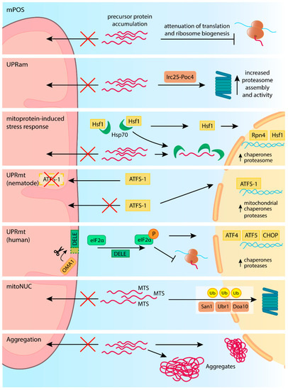 By adjusting both synthesis and degradation, stress responses are plainly aimed at balancing the precursor turnover and effectively limiting the consequences of their mislocalization. Such responses are not unique to mPOS and fall into the general proteostasis maintenance programs. The so-called integrated stress response (ISR), which downregulates general protein synthesis but upregulates specific genes in response to intrinsic or extrinsic stresses, is conserved in eukaryotic cells [153,154]. Suppressed cytosolic translation during proteotoxic stress enables the cell to concentrate on producing only selected proteins that are essential for supporting cell survival [155,156,157].