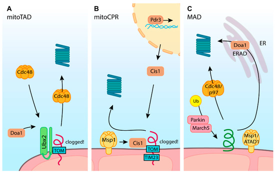 Both mitoTAD and mitoCPR were described in yeast. Ongoing research will clarify how responses to failed import events are orchestrated in other eukaryotic cells. Interestingly, key components of translocase unclogging were described in another context of mitoprotein quality control. Both Cdc48/p97/VCP and Msp1/ATAD1 contribute to the extraction of mislocalized or damaged proteins from the OM in a process called mitochondria associated degradation (MAD) (Figure 5C) [201,202,203]. In this mechanism corresponding to mitoTAD and mitoCPR, several E3 ubiquitin ligases, such as Mdm30 and Rsp5 in yeast or MARCH5/MITOL in mammals, are responsible for ubiquitination of OM substrates [204,205]. Marked proteins are released from the OM by Cdc48/VCP (yeast/mammals) with the help of Udf1, Doa1, or Vms1 proteins and driven for proteasomal degradation. Likewise, mislocalized tail-anchored proteins are extracted via Msp1 or ATAD1 in yeast and mammals, respectively. Here, proteins extracted from OM might be reinserted into the ER membrane, allowing their clearance through ER-associated degradation (ERAD) [203,206,207].