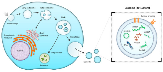Exosomes were first reported as a “type of small vesicles” in Pan and Johnstone’s sheep reticulocyte-related experiment in 1983 [50], and the name “exosome” was first used (and visually described using transmission microscopy) by Johnstone et al. in 1989 [51]. Among the groups of EVs, exosomes are the smallest (40–100 nm) [52]. They may be verified based on their cup-shaped morphology by negative-staining transmission microscopy and the presence of markers (CD9, CD63, and CD81) [53,54,55]. Besides tetraspanins, other molecules are also found on the surface of exosomes, e.g., ALIX, TSG101, HSP70, flotillin, LAMP-1, MHC-I, -II [8,12,55,56,57]. Exosomes originate as intraluminal vesicles by inward budding of endosomal membranes forming multivesicular bodies (MVBs) from internal multivesicular compartments of the endocytic pathway. Following the secretory pathway, exosomes merge with the plasma membrane and are released into the extracellular milieu or fused with lysosomes for degradation [8,9] (Figure 1).