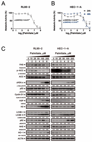 Responsiveness of human endometrial carcinoma cells to palmitate. (A,B) Metabolic activity measured using the MTT method. RL95-2, and HEC-1-A cells were treated for 24 h or 48 h with palmitate (0, 1.953125, 3.90625, 7.8125, 15.625, 31.25, 62.5, 125, 250, 500 μM). Symbols depict the mean ± SD of three independent experiments. * p < 0.05, ** p < 0.01, and *** p < 0.001 (Student’s t-tests). (C) RL95-2, and HEC-1-A cells were treated for 24 h with indicated concentrations of palmitate. Cell lysates were subjected to Western blot analysis using antibodies against the indicated proteins. Alpha actinin (ACTN) was the loading control.