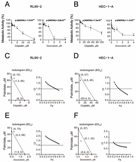 Combination indexes for palmitate with cisplatin or doxorubicin in RL95-2 and HEC-1-A cells. (A,B) Metabolic activity measured using the MTT method. RL95-2, and HEC-1-A cells were treated with doxorubicin (0, 0.0625, 0.125, 0.25, 0.5, 1, 2, 4 μM) or cisplatin (0, 0.3125, 0.625, 1.25, 2.5, 5, 10, 20 μM), (0, 1.5625, 3.125, 6.25, 12.5, 25, 50, 100 μM), respectively. Symbols depict the mean ± SD of three independent experiments. * p < 0.05, ** p < 0.01 (Student’s t-tests). (C,E) RL95-2 cells were treated for 24 h with palmitate (0, 1.953125, 3.90625, 7.8125, 15.625, 31.25, 62.5, 125, 250, 500 μM) combined with cisplatin (0, 0.3125, 0.625, 1.25, 2.5, 5, 10, 20 μM) or doxorubicin (0, 0.0625, 0.125, 0.25, 0.5, 1, 2 μM). (D,F) HEC-1-A were treated for 48 h with palmitate (0, 1.953125, 3.90625, 7.8125, 15.625, 31.25, 62.5, 125, 250, 500 μM) combined with cisplatin (0, 1.5625, 3.125, 6.25, 12.5, 25, 50, 100 μM) or doxorubicin (0, 0.0625, 0.125, 0.25, 0.5, 1, 2 μM). Metabolic activity was measured using the MTT method. Isobolograms (ED50) were calculated using CalcuSyn 2.0 software.
