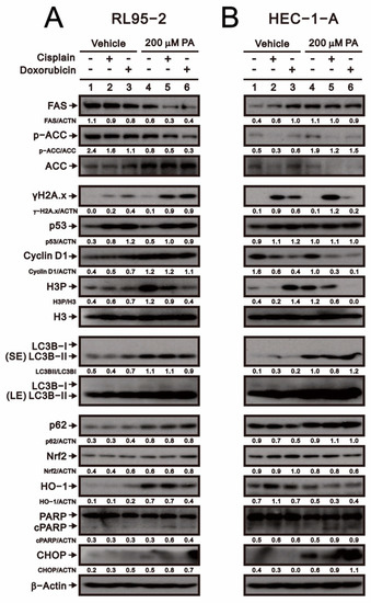We next investigated the effects of combination therapy on levels of various proteins in RL95-2 and HEC-1-A cells. In RL95-2 cells, cisplatin and doxorubicin individually increased γH2A.x, p53, and H3, and their abilities to increase levels of γH2A.x, p53, LC3B, CHOP, and cleaved PARP were all enhanced by palmitate (Figure 3A). Conversely, palmitate downregulated the effects of cisplatin and doxorubicin on FAS, HO-1, and the p-ACC/ACC and H3P/H3 ratios in RL95-2 cells. In HEC-1-A cells, palmitate downregulated the effects of cisplatin and doxorubicin on p53 and the p ACC/ACC and H3P/H3 ratios, whereas it enhanced their effects on LC3B, CHOP, and cleaved PARP (Figure 3B). These results indicate that the mechanisms by which palmitate acts in combination with chemotherapy drugs differ in RL95-2 and HEC-1-A cells.
