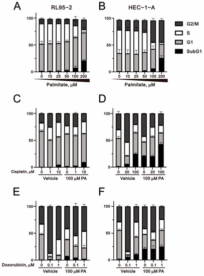 Because palmitate induced downregulation of cyclin D1, a cell cycle-related protein, in both RL95-2 and HEC-1-A cells and also significantly induced H3 and H3P (a cell cycle G2/M biomarker) in RL95-2 cells (Figure 1B), we used PI staining to test the effect of palmitate on cell cycle profiles in RL95-2 and HEC-1-A cells. In both RL95-2 and HEC-1-A cells, palmitate significantly induced cell cycle arrest in the subG1 and G2/M phases and inhibited the S phase (Figure 4A,B). Moreover, combining cisplatin or doxorubicin with palmitate enabled us to verify the cell cycle changes they reportedly induce in cancer cells (Figure 4C,D for cisplatin; Figure 4E,F for doxorubicin). It is well known that cisplatin works on G1 populations [29], while doxorubicin works on the G2/M population [30]. We found that in RL95-2 cells, combined treatment with palmitate and cisplatin increased the population at sub-G1 phase, whereas the combined treatment with doxorubicin decreased the sub-G1 phase population. In HEC-1-A cells, for palmitate in combination with cisplatin or doxorubicin, the sub-G1 phase tended to increase, which is consistent with the results summarized in Figure 2 and Figure 3 and points to a synergistic effect of the combined therapy in HEC-1-A cells.