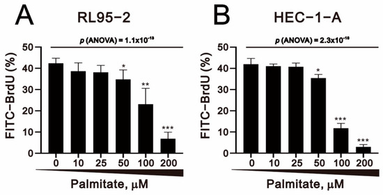 Given the finding that palmitate significantly reduced the numbers of cells at S-phase (Figure 4A,B), we used BrdU staining to assess palmitate effects on cell proliferation. Our results showed that palmitate significantly and dose-dependently reduced cell proliferation capability in RL95-2 and HEC-1-A cells (Figure 5A,B).