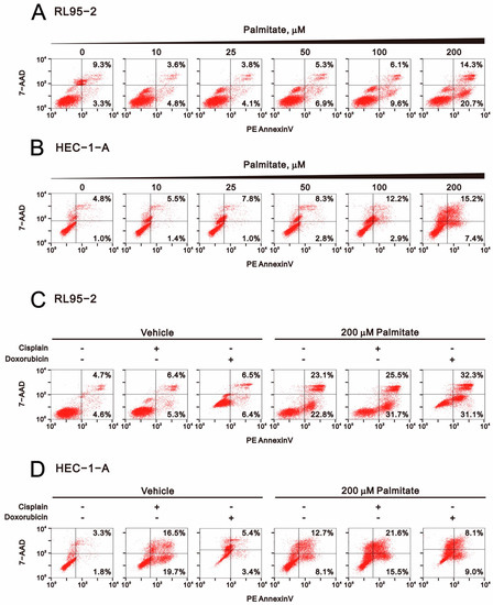 Effect of palmitate alone and in combination with cisplatin or doxorubicin on apoptosis among human endometrial cancer cells. (A) RL95-2 and (B) HEC-1-A cells were incubated for 24 h, after which they were treated for 24 or 48 h with palmitate (0, 10, 25, 50, 100, 200 μM). (C) RL95-2 cells treated for 24 h with 5 μM cisplatin or 0.5 μM doxorubicin plus 200 μM palmitate. (D) HEC-1-A cells treated for 48 h with 50 μM cisplatin or 0.5 μM doxorubicin plus 200 μM palmitate. Apoptosis markers labeled by PE-Annexin V and 7-AAD were analyzed using flow cytometry.