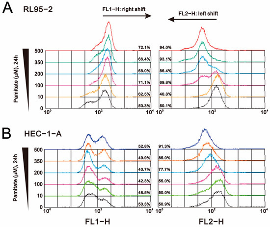 RL95-2 (6 × 105) and HEC-1-A (3 × 105) cells were seeded into 6-well plates in their respective media. The next day, selected doses of palmitate were added in fresh medium, and the cells were incubated for an additional 24 or 48 h. All dead and viable cells were then harvested, washed with PBS, and incubated with 1× binding buffer containing the MMP-sensitive fluorescent dye JC-1 for 30 min at 37 °C in the dark. The cells were then washed twice with PBS, resuspended in 500 µL of 1× binding buffer, and analyzed using a FACSCalibur flow cytometer and Cell Quest Pro software (BD Biosciences, Franklin Lakes, NJ, USA). Mitochondrial depolarization was measured on the basis of a decrease in the red/green fluorescence intensity ratio.