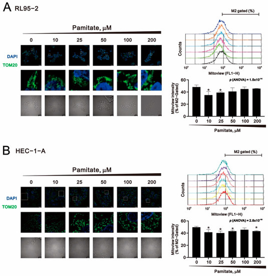 RL95-2 (6 × 105) and HEC-1-A (3 × 105) cells were seeded into 6-well plates in their respective media. The next day, the cells were treated with selected doses of palmitate for 1.5 h and stained with 20 µM MitoViewTM Green (Biotium, CA, USA) for 30 min at 37 °C in the dark. Samples were then evaluated using a FACSCalibur flow cytometer and Cell Quest Pro software (BD Biosciences, Franklin Lakes, NJ, USA).