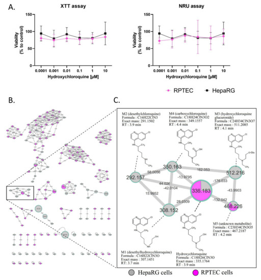 Cytotoxicity and visualization of in vitro HCQ metabolism using molecular networking. Differentiated HepaRG and RPTEC were incubated with HCQ (10 µM) for 48h (at least three experiments in both cell lines). (A) Cytotoxicity was evaluated using XTT and NRU assays. Cell viability was calculated compared to control conditions after 48 h of treatment. (B) The molecular network. Each cell type is depicted in a specific color: HepaRG cells in grey and RPTEC in pink. (C) Details of the specific HCQ-containing cluster. Nodes are labelled with the exact protonated mass (m/z) and the links are labelled with the exact mass shift. Proposed metabolites of HCQ structure are linked to the corresponding nodes.