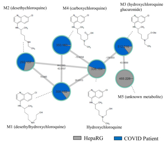 In order to compare our in vitro findings to the in vivo data, we performed a sample-to-sample comparison using molecular networking, including a blood sample of COVID-19 patient treated by HCQ and our culture media of differentiated HepaRG incubated by HCQ (10 µM) for 48 h (Figure 2). The HCQ-containing cluster visual analysis revealed that all putative metabolites (M1 to M5) found in our in vitro experiment were present in the patient’s blood sample, highlighting the relevance of the HepaRG cell model in HCQ metabolism study. Among all of the metabolites, the M5 plasma level was, however, very low in this patient.