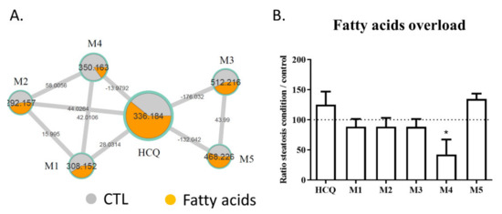 Levels of HCQ and its metabolites detected in the culture medium of HepaRG cells treated or not with fatty acids. The metabolism of HCQ incubated on HepaRG cells without (control condition) or with fatty acids overload was evaluated after 10 days of treatment. (A) Details of the specific hydroxychloroquine-containing cluster. Nodes are labelled with the exact protonated mass (m/z) and the links are labelled with the exact mass shift. (B) Ratio of the peak area of each compound (HCQ, M1 to M5) in the condition of fatty acid treatment to the peak area of each compound in control condition. M1: desethylhydroxychloroquine; M2: desethylchloroquine; M3: hydroxychloroquine glucuronide; M4: carboxychloroquine; M5: Unknown metabolite. The data are quoted as the mean ± SEM from three independent experiments performed in triplicate. Intergroup differences were tested in a two-way ANOVA. * p < 0.05 for fatty acids overload condition compared with the control condition for each compound (arbitrary set to 100%).