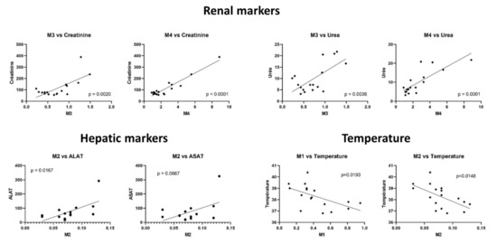 Considering the markers of renal function, the urea and creatinine were positively correlated with a higher level of M3 and M4 in patient samples (Pearson correlation coefficient between 0.67 and 0.95), thus suggesting a renal elimination. Positive linear correlations were found between M2 level and both AST and ALT activities (Pearson correlation coefficient of 0.5 and 0.61, respectively). Temperature was negatively correlated with lower levels of M1 and M2 in patient samples (Pearson correlation coefficient between -0.56 and 0.59, respectively). Linear correlations are plotted in Figure 5, which also shows the respective p values. Linear correlations between the M5 level and PaO2 or procalcitonin (PCT), which were possibly biased because of one extreme value of M5 in the patient cohort, are shown in Supplementary Figure S3.