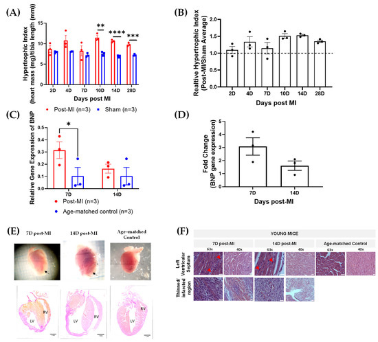 Besides hypertrophic index and BNP gene expression levels, HF progression was evaluated on a structural front. The event of hypertrophy is evident from the obvious ventricular septal hypertrophy at 7D and 14D post-MI in histology sections (Figure 2E) [19]. On the other hand, the heart is significantly enlarged at 14D post-MI as compared to 7D post-MI and the age-matched control (Figure 2E). These are clinical features of dilated cardiomyopathy [20], which eventually lead to HF.