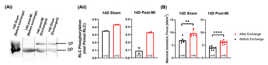 To explore the potential of RLC phosphorylation in reversing diseased muscle contractility, phosphorylated recombinant RLCs were exchanged (in vitro) into permeabilised papillary muscles isolated from 14D post-MI mice hearts. After the exchange procedure, the phosphorylation levels in 14D post-MI fibres were enhanced from 0.09 ± 0.04 mol Pi/mol RLC to 0.33 ± 0.007 mol Pi/mol RLC (Figure 5Aii). However, it was not possible to enhance the phosphorylation levels to match 14D sham (non-exchanged) papillary segments. The maximal isometric force of 14D post-MI fibres was increased from 3.95 ± 0.2 kN/m2 to 6.20 ± 0.2 kN/m2 after the exchange procedure (with 25 mM P-RLC, 27 mM TnC). However, the force produced did not recover to match the force produced by 14D sham papillary (non-exchanged) segments (Figure 5B). This could be due to RLC phosphorylation levels not being enhanced to suitable levels (0.35–0.42 mol Pi/mol RLC), as mentioned in Section 2.3. Nonetheless, in permeabilised muscle models where other signalling mechanisms are disrupted, increased RLC phosphorylation levels are able to enhance the isometric force of contraction. The phosphorylation and force values are summarised in Table S3.