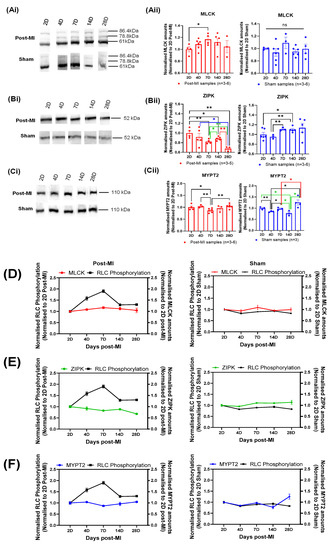 Longitudinal changes in enzymes in mice. (Ai,Bi,Ci) The blot images of MLCK, ZIPK and MYPT2, respectively. (Aii,Bii,Cii) Bar graph of normalised MLCK, ZIPK and MYPT2 amounts of post-MI and sham populations, respectively. All sample populations are normally distributed and validated by Shapiro–Wilk test. Differences in the standard deviations between two timepoints were tested by F-test. Unpaired one-tailed t-test with Welch’s correction (*) was performed on those with significant differences in the variances, while unpaired one-tailed t-test (*) was performed for all other samples. Note: n = 3–6, derived from at least two mice for post-MI and three mice for sham (except 7D sham, where one mouse was used). Note: ‘n’ refers to the number of technical replicates; * p < 0.05, ** p < 0.01. (D–F) Line graph plotted with normalised enzyme values and RLC phosphorylation to depict longitudinal changes in post-MI and sham populations.