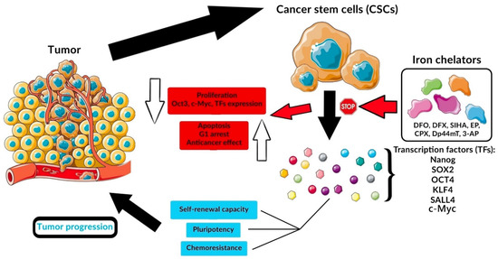 The proven antitumor activity of chelating agents prompted researchers to further investigations to elucidate their exact mechanism of action. A new direction of research is studying the effect of iron chelators on markers of CSCs. Figure 1 shows the effect of iron chelators on tumor stem markers and thus tumor progression.