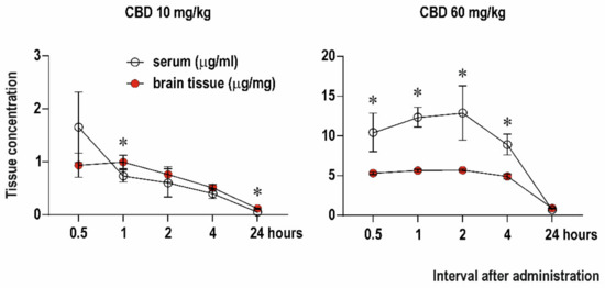 Tissue concentration of CBD. Levels of CBD in serum (μg/mL of plasma, empty circles) and in brain tissue (μg/mg of tissue, red circles) assessed in 5-time intervals after drug administration (0.5–24 h; axis x). CBD was administered intraperitoneally in doses 10 mg/kg (left panel) or 60 mg/kg (right panel). Data are expressed as a mean ± SD. Asterisks denote a significant difference between plasma and brain levels.