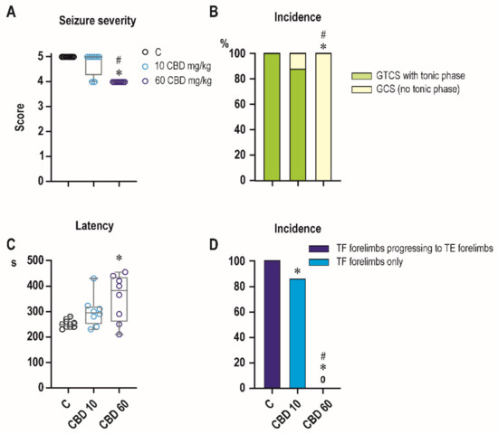 Effects of CBD in PTZ model. Effects of CBD in two doses (10 and 60 mg/kg) on PTZ-induced seizures. CBD in a dose of 60 mg/kg significantly decreased seizure severity (A) and this effect was driven mostly by specific suppression of tonic component of generalized tonic-clonic seizures (B). The percentage of animals exhibiting complete generalized tonic-clonic seizures (green) and generalized seizures without tonic phase, i.e., generalized clonic seizures (yellow) is on axis y. In this dose, CBD resulted in increase of latency to generalized seizures (C). In lower dose of 10 mg/kg, CBD blocked transition from tonic flexion (pale blue; TF forelimbs only) to tonic extension on forelimbs (dark blue; TF forelimbs progressing to TE forelimbs) (D). Asterisks denote a significant difference in comparison with controls, # denote a significant difference in comparison between different doses of CBD. x axis in all three graphs presents control and two groups with different doses (10 and 60 mg/kg) of CBD. Data in graphs (A,C) are presented as box plots (the sample median and the first and third quartiles) with whiskers (min and max). Circles mark individual values.