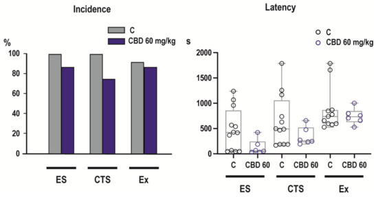 Effects of CBD in NMDA model. Pre-treatment with 60 mg/kg CBD did not affect incidence (left panel) of any evaluated parameters of NMDA-induced seizures—emprostotonic (flexion) seizures (ES), generalized clonic tonic seizures (CTS) or mortality (Ex). Latencies (right panel) of individual parameters did not differ from controls. Other details as in Figure 2.