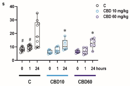 Two-way RM ANOVA revealed significant effects of time after CBD administration (F2,54 = 18.14, p < 0.0001) and treatment (F2,54 = 6.619, p < 0.0001). Administration of CBD resulted in significant shortening of time spent on the bar compared to controls in the 3rd test, i.e., 24 h after administration a dose of 10 mg/kg (p = 0.0029) as well as 60 mg/kg (p = 0.0102). Controls spent on the bar significantly longer time in 24 h-interval (i.e., at P13) compared to time assessed at P12 (0.5 h and 1 h interval; p < 0.0001 and p > 0.0001, respectively) (Figure 4).