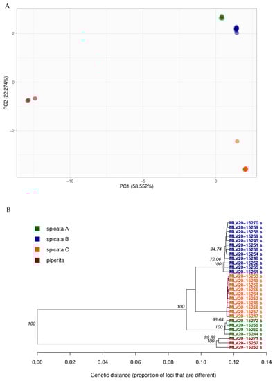 Overall diversity patterns in mint from the northwest Andes. (A) PCA analysis from 2033 loci distributed in 912 transcripts. The first component explained 58.56% of the variance, and the second component explained 22.27% of the variance (both totaling 80.83% of explained variance). Clustering validation was performed using the algorithms NbClust and optCluster, which suggested a total of four clusters: three of M. spicata (spicata A, spicata B and spicata C) and one of M. × piperita. All clusters were recovered by the first two components. (B) Dendrogram carried out by UPGMA analysis from 2033 variants distributed in 912 transcripts using Nei’s distance and bootstrap as resampling method with 10,000 replicates. These results also suggested a total of four clusters: three from M. spicata (spicata A, spicata B and spicata C) and one for M. × piperita. Clusters under both approaches in (A) and (B) are fully concordant.