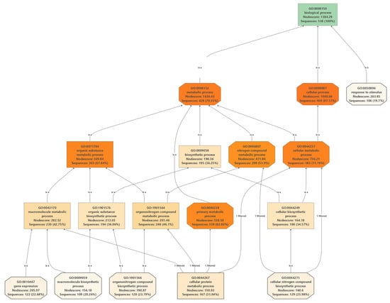 We first explored the top GO terms in each pathway using the high Nodesores and number of associated transcripts. In the biological pathway (Figure 2), we analyzed the GO terms in the Nodescore range from 35,822 to 1471.06 and the number of associated transcripts ranging from 365 to 428 sequences. The main GO terms were related to proteins of carbohydrate and energy metabolism (GO:0044237 and GO:0044238) and the synthesis of cysteine and methionine metabolism (GO:0008152 and GO:0009987) (Table S4). In the molecular pathway, we analyzed the GO terms in the Nodescore range of 626.86 to 704.47 and the number of associated transcripts ranging from 349 to 380 sequences. The main GO terms were related to proteins with catalytic activity, biosynthetic process and regulation of transcription (GO:0003824) (Table S4). On the other hand, for the cellular pathway, we analyzed the GO terms in the Nodescore range of 762 to 1224.97 and the number of associated transcripts ranging from 305 to 409 sequences. GO terms related to proteins linked in intracellular anatomical structure (GO:0005622) (Table S4).
