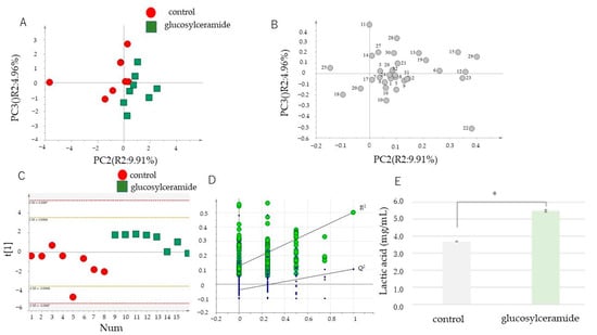 Metabolite analysis of the Blautia coccoides culture treated with glucosylceramide. (A) Score plot of principal component analysis (PCA) of metabolites of B. coccoides treated with or without 20 μg/mL glucosylceramide. (B) Loading plot of metabolites of B. coccoides treated with or without 20 μg/mL glucosylceramide. The substances corresponding to the numbers are listed in Table 1. (C) Partial least squares-discriminant analysis (PLS-DA) of metabolites of B. coccoides treated with or without 20 μg/mL glucosylceramide. (D) The validated plot of PLS-DA of metabolites of B. coccoides treated with or without 20 μg/mL glucosylceramide after a permutation test (n = 200). (E) Lactic acid concentration (mg/mL) of B. coccoides cultures (24 h) treated with or without 20 μg/mL glucosylceramide and 2 mM DCA from the start of the culture in YCFA medium. Statistical difference of the means was verified using one-sided unpaired Student’s t-test (n = 3, * p < 0.05).