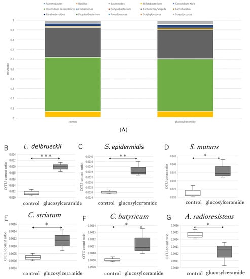 Relative OTU ratios of microbes treated with glucosylceramide. (A) Average relative OTU ratios of all microbes treated with glucosylceramide. Relative OTU ratios of (B) L. delbrueckii, (C) S. epidermidis, (D) S. mutans, (E) C. striatum, (F) C. butyricum and (G) A. radioresistens treated with glucosylceramide. Data are expressed as means ± standard errors. Data normality was verified using the Shapiro–Wilk test. Statistical differences in means of data with normalities were analyzed using a one-sided unpaired Student’s t-test (n = 3; * p < 0.05, ** p < 0.01, *** p < 0.001).