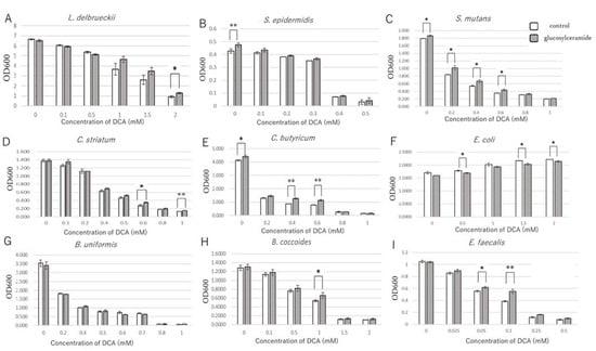 Growth of bacteria supplemented with various concentrations of deoxycholic acid (DCA) and glucosylceramide. OD600 values for (A) L. delbrueckii, (B) S. epidermidis, (C) S. mutans, (D) C. striatum, (E) C. butyricum, (F) E. coli, (G) B. uniformis, (H) B. coccoides and (I) E. faecalis. Values are mean ± standard errors of triplicate independent cultures. Statistical differences of the means were evaluated by one-sided unpaired Student’s t-test (n = 3, * p < 0.05, ** p < 0.01).