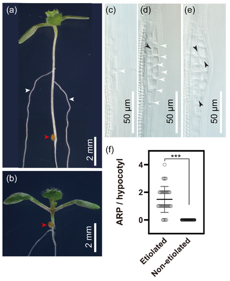 Light sensing triggers photomorphogenesis in dark-grown seedlings [68]. At the level of the hypocotyl, this includes the arrest of elongation [69], apical hook opening [70] and induction of adventitious roots (AR) [36]. The role of light and the process of photomorphogenesis on AR formation is, however, the least well understood. Therefore, we chose to study this in Arabidopsis thaliana, in which many mutants in light signaling and photomorphogenesis are readily available. The exposure of etiolated seedlings to light induced AR formation in Arabidopsis thaliana hypocotyls [71,72], while no AR appeared in the hypocotyls of seedlings that were germinated in the light (Figure 1a,b). Light-grown seedlings did not show indications of cell divisions or arrested primordia, which was visualized upon tissue clearing in the etiolated seedlings exposed to light (Figure 1c–e, Figure S1). An average of 1.487 AR primordia (ARP) were observed in hypocotyls of the etiolated seedlings transferred to light conditions (Figure 1f). Etiolation is therefore a critical precondition for light-dependent AR induction in Arabidopsis thaliana hypocotyls.