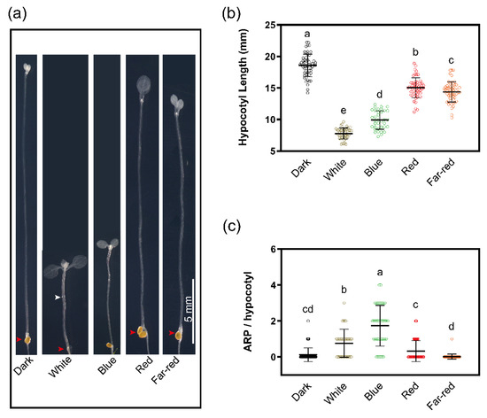 Hypocotyl elongation and adventitious root formation under different light sources. (a) Representative hypocotyl images of three-day-old etiolated WT (Col-0) seedlings that were illuminated with different LED light for 4 days. White arrowheads indicate ARPs, the red arrowhead points to the hypocotyl root junction. (b) Quantification of the hypocotyl length of the seedlings as in (a). (c) Quantification of the number of ARP in the hypocotyl of the seedlings as in (a). The data in (b,c) are represented as mean values ± SD, n-dark = 56; n-white = 34; n-blue = 38; n-red = 53; n-far-red = 51). Different letters indicate a significant difference at p ≤ 0.05 (ANOVA and LSD post hoc analysis). Scale bar: 5 mm. All images were taken at the same magnification.