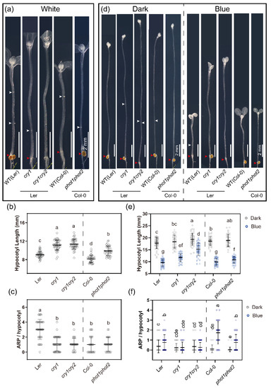 Since blue light is perceived by cryptochromes (cry1 [73], cry1cry2 [74]) and phototropins (phot1phot2 [75]), we analyzed the contributions of these receptors to hypocotyl elongation and AR formation. Hypocotyls elongated in the dark (Figure 2b and Figure 3e), and this was suppressed by white (Figure 2b) and blue (Figure 2b and Figure 3e) light as expected. This suppression was significantly less in cry1, cry1cry2 and phot1phot2 mutants (Figure 3b). In the dark, AR formation in the photoreceptor mutants did not differ from the wild type controls (Figure 3d,f). In white light, ARP formation was strongly reduced in cry1 and cry1cry2 (Figure 3a,c), suggesting that blue light receptors are more important for AR formation than red and far-red signaling. Therefore, we explored in more detail the blue light signaling components (Figure 3). In white light, the cryptochrome mutants cry1 and cry1cry2 had longer hypocotyls than WT (Ler) and phot1phot2 (Figure 3a,b), while AR formation in all tested blue light receptors was significantly reduced (Figure 3a,c). In blue light, a similar response was observed, except for the phot1phot2 mutant that was responsive to blue light by inhibiting hypocotyl elongation (Figure 3d,e) and stimulating AR formation (Figure 3d,f). These data suggest a prominent role for CRY in hypocotyl elongation and AR formation, whereas PHOTs are not required for elongation and play only a minor role in AR formation.