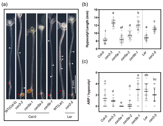 Since de-etiolation by white and blue light increased the ARP number, we asked whether activation of photomorphogenesis was sufficient for AR induction. To test this, constitutively photomorphogenic mutants of the COP9 signalosome were analyzed. Constitutive photomorphogenesis mutants produce short hypocotyls in the dark [76,77] and since hypomorphic alleles have been identified, namely, csn2-5 [78], csn3-3 [79], csn5a-1 [80], csn5a-2 [80] and csn5b-1 [80], these were analyzed. These weak alleles did not show the short hypocotyl phenotype and instead, with the exception of csn3-3, hypocotyls were longer than the corresponding WTs (Figure 4a,b).