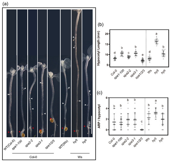 The hypocotyl of etiolated spa1-100 [85], spa2-2 [86] and spa3-1 [87] was slightly longer than WT (Figure 5a,c), consistent with SPA involvement in shade-avoidance [88]. In contrast, the spa1-3spa2-1spa3-1 (spa1/2/3) triple mutant [82] had a slightly shorter hypocotyl (Figure 5a,b). The moderate hypocotyl elongation defect in spa1/2/3 is likely due to the presence of sucrose in the medium [82].