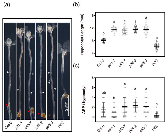 Phytochrome-Interacting Factors (PIFs) are basic helix-loop-helix (bHLH) transcription factors (TFs) that accumulate in the dark to promote skotomorphogenesis [90,91] and act antagonistically to HY5 in light responses [41,92,93]. To determine whether the etiolation factors PIF control AR formation, phenotypic responses in dark–to-light growth conditions were analyzed for single mutants pif1-1, pif3-7, pif4-2 and pif5-3,and the multiplex mutant pifQ [42]. The single mutants developed slightly longer hypocotyls than the wild type (Figure 6a,b). In contrast, pifQ had shorter hypocotyls (Figure 6a,b), consistent with PIF functional redundancy in suppressing photomorphogenesis [94,95].