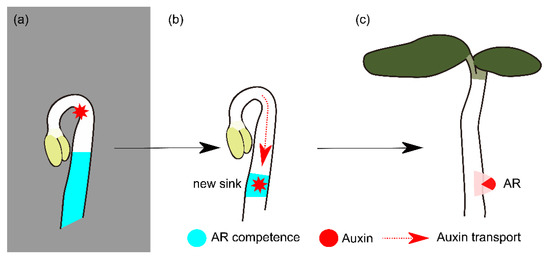 During skotomorphogenesis, auxin biosynthesis rates are high to stimulate rapid growth and to maintain the apical hook [123,124] (Figure 7a). The transfer to light and activation of photomorphogenesis causes an important relocalization of auxin and suppression of auxin signaling in the entire hypocotyl, resulting in an arrest of hypocotyl growth and the induction of apical hook opening (Figure 7b). We anticipate that the redistribution of auxin, further facilitated via blue light effects on auxin transport, results in local auxin maxima in the pericycle that are sufficiently strong to trigger asymmetric division and AR formation. Over time, light signaling and photomorphogenesis install auxin resistance at the level of the signaling machinery, precluding further AR induction (Figure 7c). Future studies to test this hypothesis require the analysis of temporal changes of auxin levels and transport in the Arabidopsis thaliana hypocotyl.