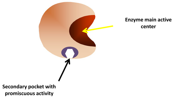 We have been unable to find reports describing natural enzymes bearing two independently active centers except when some natural fusion enzymes are formed, but these will be treated in the next section. An exception to this fact is the enzymes exhibiting activity promiscuity. Substrate promiscuity is related to enzyme specificity, and it is not a surprise that an enzyme can recognize many different substrates, since many enzymes have low specificity (an outstanding example are lipases, which are able to recognize many different substrates) or can catalyze diverse-related reactions using the same catalytic center that is used for the physiological reaction, as happens in ester hydrolysis, esterification, transesterification and so on [59,60,61]. These are enzymes with a broad specificity and are able to catalyze very diverse reactions. However, here we refer to a promiscuous activity, that may be defined as the capacity of the enzyme to catalyze a reaction far from the physiological activity of the enzyme, that is, with different chemo-selectivity. An example may be a hydrolase able to produce carbon–carbon bonds or exhibiting an oxidative activity. This is the real enzyme promiscuity, and it is postulated that it has been somehow related to the evolution of organisms, as first step before gene diversification to obtain new enzyme activities [62,63,64]. These promiscuous activities may be of interest when there are no alternative natural enzymes able to perform the reaction [65,66,67,68,69,70,71,72,73]. In many examples, it has been shown that this secondary catalytic activity requires a folded enzyme structure (that is, it is not a consequence of the catalytic activity of individual amino acids) but that did not involve the active center of the enzyme (as the activity remains after blocking the active center of the enzyme with irreversible inhibitors) [74,75]. This can suggest that the active center responsible for this activity may be placed in a different position, perhaps in a different pocket of the enzyme surface (Figure 1). As the standard enzyme activity, this promiscuous activity may be modulated by enzyme immobilization [74]. However, the catalytic activity values are usually moderate, and obviously, the main active center and this promiscuous activity may be utilized to catalyze cascade reactions only randomly [76]. Nevertheless, we wanted to mention this possibility as an example of natural enzymes bearing two active centers.