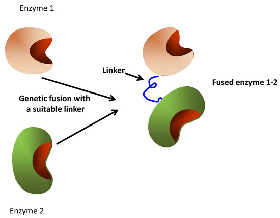 Considering the advantages of having a single molecule bearing two desired catalytic activities, researchers have tried to imitate nature and produce fusion enzymes for a long time (Figure 2). These fusion enzymes have been used in biomedicine [96], in vivo to produce target metabolites via fermentation [97,98,99,100,101,102] or as isolated bifunctional enzymes to catalyze cascade reactions [103,104,105,106,107,108,109,110,111,112,113]. The selection of appropriate linkers between the involved enzymes is a critical point in the design of these fusion proteins, to permit a proper folding of both fused enzymes [114]. In some instances, the researchers fused more than two enzymes [115].