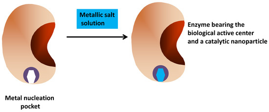 Another strategy consists of using the enzyme as a scaffold to get a metal nanoparticle attached to the enzyme (Figure 3). In fact, the use of different organisms to produce transition metal nanoparticles in a greener way has been proposed by some authors, in vivo or in vitro [122,123,124,125,126,127,128,129,130,131]. The production of nanoparticles employing enzymes as inductors of the metal nanoparticle formation in aqueous media is a well-known possibility [124,132,133]. Thus, it is possible to build enzymes bearing metal nanoparticles to get multifunctional hybrid-enzymes. One example of this may be the use of an alcohol oxidase to produce an in situ nanoparticle, used as an amperometric alcohol biosensor [134]. There are many other interesting examples of this kind of hybrid biocatalyst [135,136,137,138].
