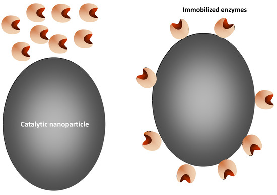 The enzyme activity recovery depended on the metal. This biocatalyst was utilized in the cascade reaction (enzymatic hydrolysis plus metal catalyzed reduction) for the transformation of p-nitrophenyl butyrate to p-aminophenol [139]. One obvious alternative to this strategy is to utilize the enzyme immobilized in a nanoparticle containing the metal [140] (Figure 5). While the first strategy utilizes a green method to produce the aggregate in one step, the second permits better control of the enzyme-support interactions, which, as discussed in the introduction section, may permit a better final enzyme stability/activity. Another example of the preparation of a metal/enzyme precipitate is the production of an oxidase precipitate hosting small spherical palladium nanoparticles that present catalytic competence for both the biocyclization as well as the C–C bond-forming cross coupling [141].