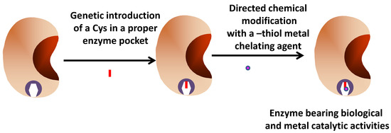 These strategies may present some problems, because the metal can still be dissolved under certain conditions affecting the enzyme activity and also decreasing the metal activity. The insertion of an organometallic catalyst onto a specific point of the enzyme is a more elegant way to reach the desired goal (Figure 6). In one interesting example, the lipase from Geobacillus thermocatenulatus was utilized. This is a peculiar lipase presenting a double lid [142]. They optimized the solid-phase modification of the active center of the enzyme [143], and later on, this protocol was extrapolated to the modification of the position 196 (where a Cys had been genetically introduced), located in the external face of the main lid, with a thiol reactive-organometallic complex. The position where the Cys was introduced was justified by the authors because the introduction on this position of a peptide had previously permitted a strong modulation of the enzyme selectivity, revealing their importance [144]. Very interestingly, the authors showed the great impact of the immobilization strategy on the expressed activity of the introduced organometallic catalyst [143]. This was explained by the necessity of having the open form of the lipase to leave accessible the new catalytic groups. The new immobilized hybrid enzyme was utilized in a cascade reaction to produce aminoarene from a nitroarene ester [143].