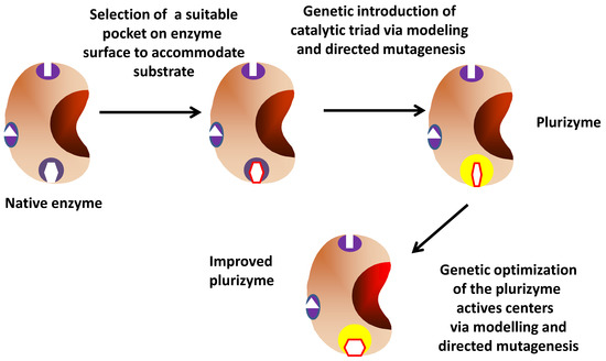 The natural catalytic Ser of the native enzyme was then mutated (Ser161Ala) to eliminate the native enzyme activity and ensure the functionality of the new active center. The authors found activity of the new active center versus 24 substrates, obviously with different specificities and activities when compared to the native active center. This catalytic activity was dependent on the two mutations introduced to generate the catalytic triad as well as of the natural Ser211. Then, the authors generated an enzyme bearing the two intact catalytic centers. The specific activity of the double active center enzyme for all accepted esters was lower than that observed for the native enzyme, but higher than that for the enzyme bearing only the artificial active center [149]. The enzyme specificity was not enlarged, as the scaffold enzyme was already one esterase bearing a very broad specificity. However, the enzyme bearing the two active centers gave an altered substrate/activity (giving a sigmoidal curve) and pH/activity (giving a narrower peak) curves. This is the only example of a design of plurizymes in the literature to date, and it may be considered a proof-of-concept using relatively simple active centers to facilitate the success. However, it is expected that many other examples may follow this model, perhaps plurizymes, which not only show two different active centers, but also with two different catalytic activities.