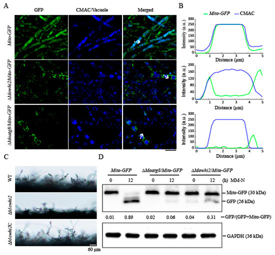 In M. oryzae, mitophagy occurs in the foot cells and invasive hyphae to promote conidiation and infection [20,21]. In a previous study, we found that the deletion of MoWHI2 not only led to abnormal appressorium formation but also highly reduced conidiation and invasive growth [19]. Thus, we speculated that MoWhi2 may participate in mitophagy as Whi2 in yeast [13]. To test this hypothesis, the MoWHI2 deletion mutant was generated in the Mito-GFP background, which is a well-used strain for monitoring mitophagy in M. oryzae [20,21,24]. The ΔMoatg8/Mito-GFP strain, which is defective for all types of autophagy, including mitophagy, served as a negative control. The resultant mutant ΔMowhi2/Mito-GFP, Mito-GFP and ΔMoatg8/Mito-GFP strains were grown in glycerol medium and transferred to nitrogen-starvation medium for 6 h to induce mitophagy. Then, the mycelia were stained with CMAC (7-amino-4-chloromethylcoumarin) dye to visualize the vacuoles and imaged with a confocal microscope. As shown in Figure 1A,B, the vacuolar localized GFP signal was evident in starved mycelia, indicating mitophagy was induced in the Mito-GFP strain. In contrast, similar to the negative control ΔMoatg8/Mito-GFP, the GFP signal could not be detected in the vacuoles in the ΔMowhi2/Mito-GFP strain, suggesting that MoWhi2 is involved in mitophagy. Similarly, microscopic observations showed that few conidiophores had differentiated in ΔMowhi2, revealing that the sporulation of the MoWHI2 mutant was significantly reduced (Figure 1C). To further confirm this result, a Western blot assay was performed with anti-GFP antibody to assess the degradation of fusion protein Mito-GFP. Consistent with the fluorescent observation in the ΔMoatg8/Mito-GFP strain, deletion of MoWHI2 resulted in a decreased degradation of Mito-GFP at indicated time points, suggesting that there are defects in mitophagy in the MoWHI2 deletion mutant (Figure 1D). Based on these results, we concluded that MoWHI2 is required for mitophagy in M. oryzae.